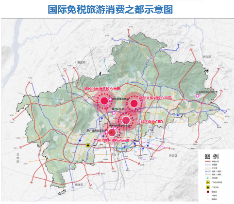 · 国际化消费商圈打造行动:打造广州北站免税商圈、主城区CBD总部经济商圈、融创文旅城都市休闲商圈、狮岭时尚消费展贸商圈4个国际化商圈。