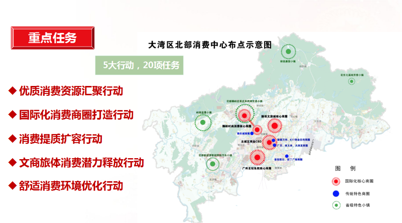 · 优质消费资源汇聚行动:包括提升白云国际机场、广州北站空铁联运大综合交通枢纽能级,汇聚经济要素;加大招商引资力度,汇聚国内外名牌名品;推动优势产业集群转型,塑造花都特色品牌3项任务。