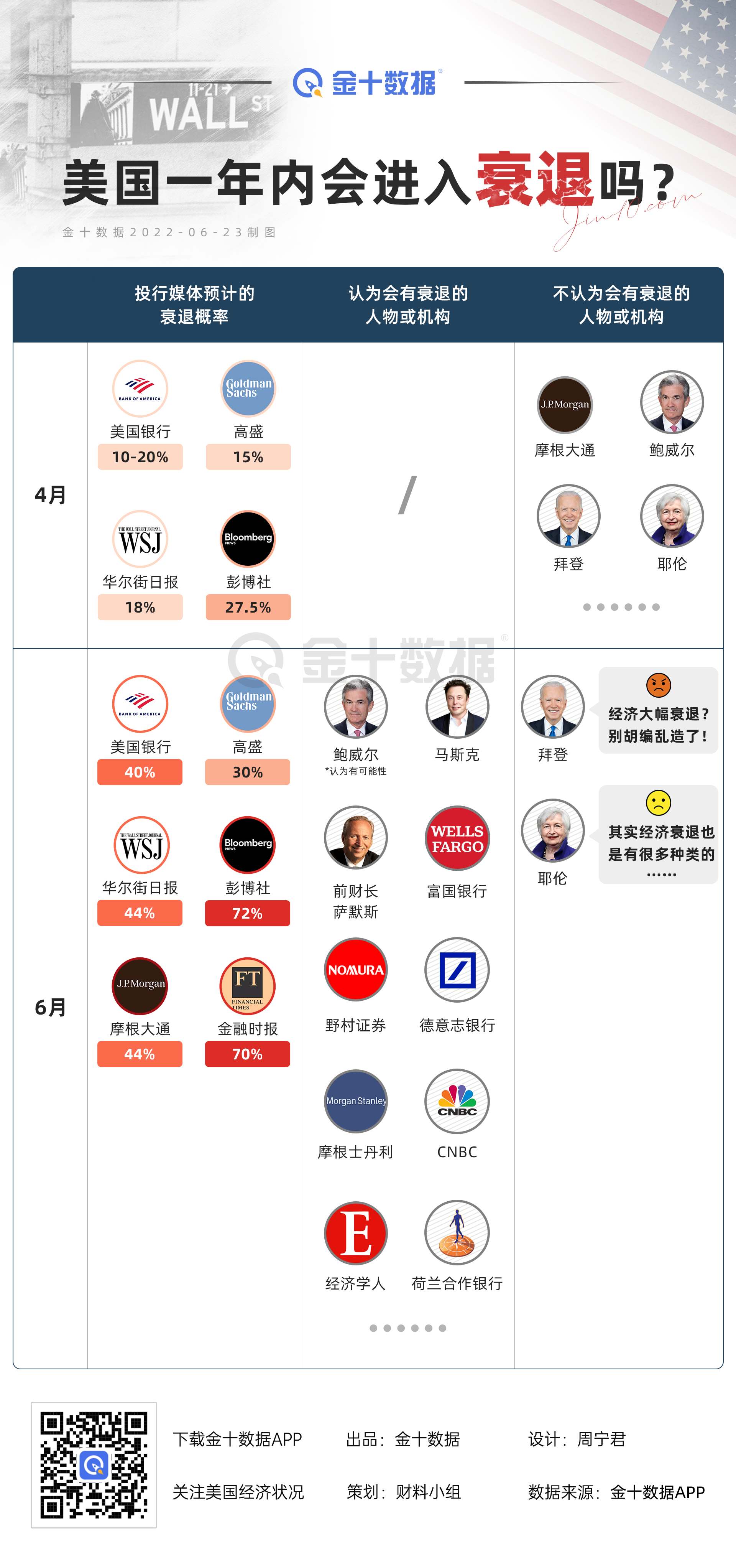 尽管高通胀引发了对美国经济的担忧,但早在4月份,一些机构调查显示,多数经济学者认为1年内美国经济衰退的概率在20%左右。而进入6月,在美联储“暴力”加息75个基点之后,唱衰美国经济的讨论甚嚣尘上。越来越多的媒体、投行以及行业大佬,纷纷认为美国在1年内进入经济衰退期的风险急剧上升。