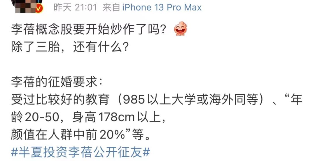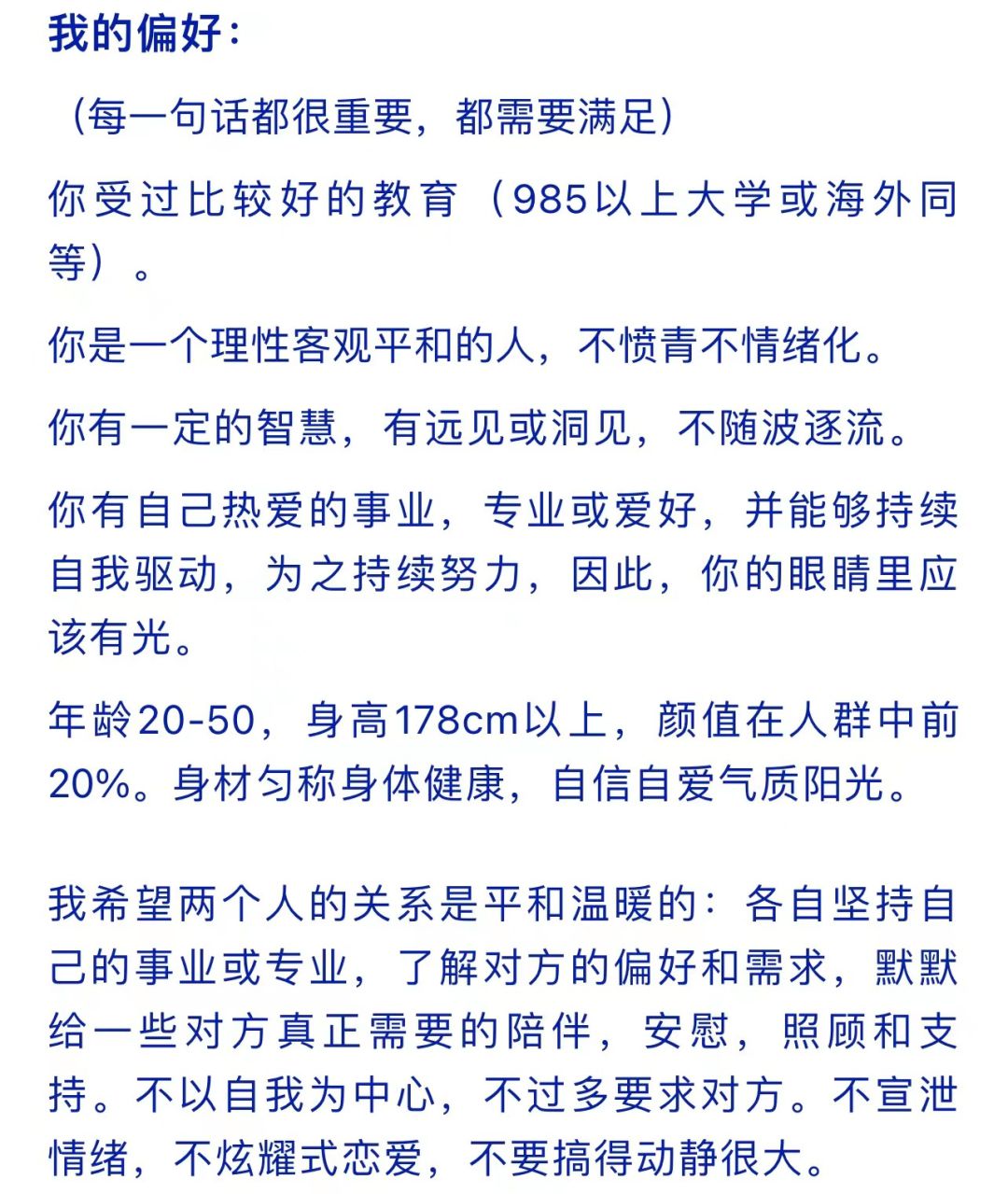 其中“受过比较好的教育(985以上大学或海外同等)”、“年龄20-50,身高178cm以上,颜值在人群中前20%”等标准引起热议。
