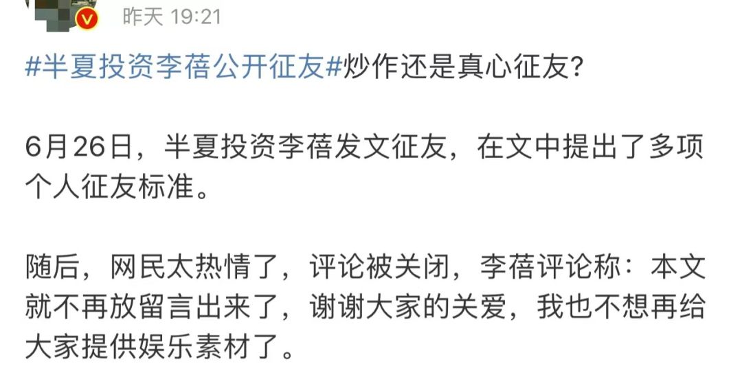 对于李蓓的公开征友,业内褒贬不一。有人感慨,她的征友贴行文坦率真诚,是真性情的表现;但也有人认为,她在自家公司官微发布此类个人信息并不妥当,存在炒作嫌疑。