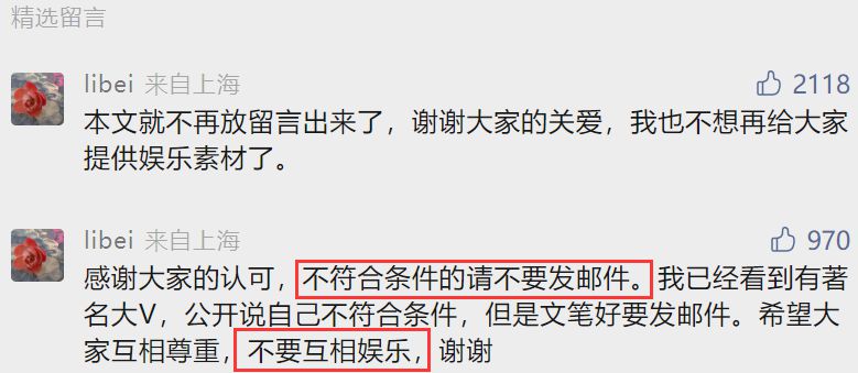 目前该文只放出的两条李蓓自己的评论,表示是因为“不想再给大家提供娱乐素材”,也强调“不符合条件的不要发邮件”。