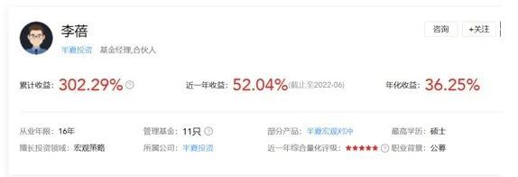 根据私募排排网数据显示,半夏投资目前管理规模在50-100亿区间。李蓓从业16年以来,累计收益高达302.29%,近一年收益率为
