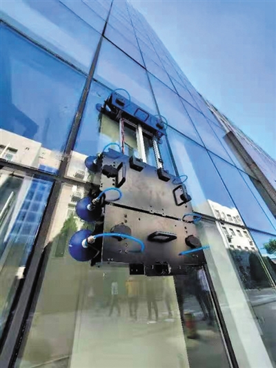 团队在安全方面下了大力气。除多吸盘外,团队还自主研发了伺服悬吊系统,为“飞檐走壁蜘蛛侠”附上“双保险”。悬吊系统安装在机器人本体上,取代了卷扬机,且承载机器人全部自重,最大限度降低玻璃负重,“有绳就能上下爬。”