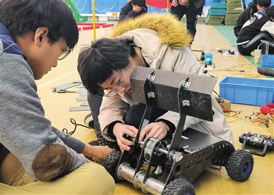 2021年12月,北京工业职业技术学院气膜馆,“飞檐走壁蜘蛛侠”团队在为校内赛调试机器人。受访者供图