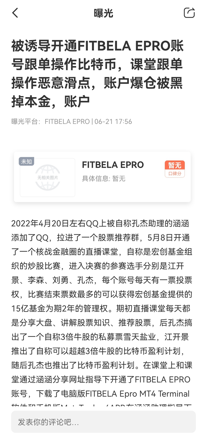 在课堂上,投诉汇友和不少其他学员根据孔杰助理分享的网址,下载了电脑版FITBELA Epro MT4 Terminal软件和手机MT4 APP,并开始学习如何交易比特币。孔杰还根据投入资金大小,将学员划分为4个梯队,资金最低的梯队都要求投资款不低于50000美金。