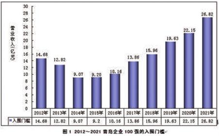 从入围门槛来看,2021青岛企业100强的入围门槛为营业收入26.82亿元,比上年(22.15亿元)上升4.67亿元,上升了21.08%。