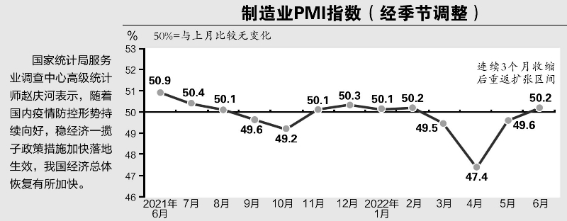 6月份,制造业PMI回升0.6个百分点至50.2%,连续3个月收缩后重返扩张区间。