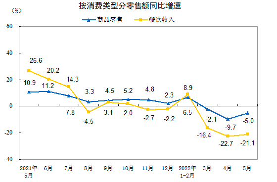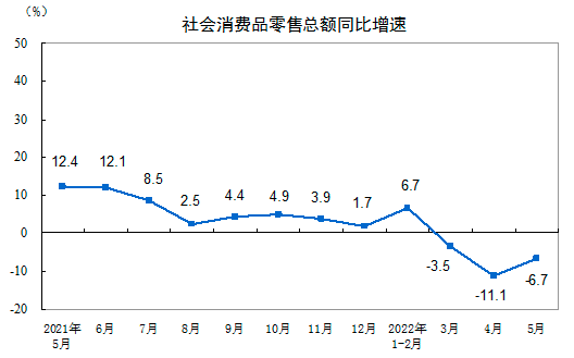 5月份,社会消费品零售总额33547亿元,同比下降6.7% 图片来源:国家统计局