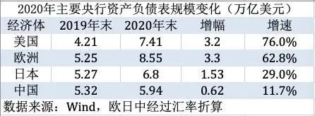 中国央行也推出多项举措应对疫情冲击,但相当克制。在价格型工具方面,中国央行2020年先后下调了逆回购利率、MLF利率,但仅下调了30BP;在数量型工具方面,中国央行通过多次降准和公开市场操作释放流动性。但从资产负债表来看,中国仅小幅扩张。Wind数据显示,2020年末中国央行资产负债表规模为5.94万亿美元,相比2019年末扩张11.7%。