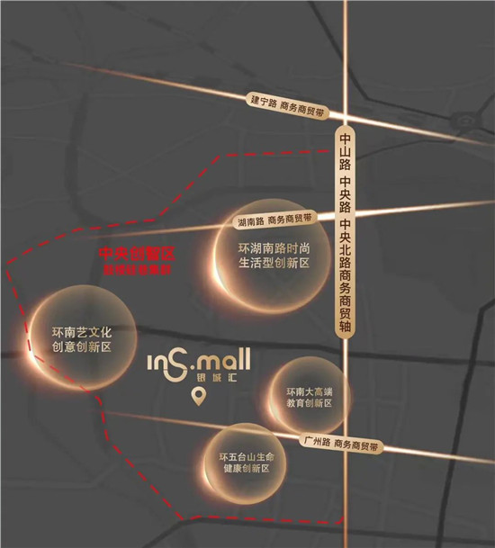 围绕INS.Mall银城汇,周边1.5公里还聚合了100余家省级机关、3000余家企事业单位、三大文化旅游名片,以及环南大知识经济圈、新街口-湖南路商务商贸业、环南艺艺术文化街区三大产业集聚区。