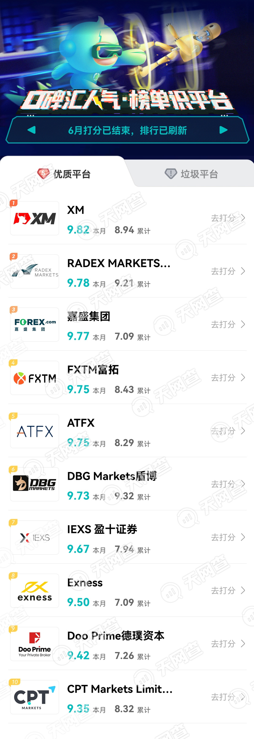 天网查6月平台口碑榜单已出炉,看看上个月哪些平台斩获了更多高分口碑,同时,也可以为你选择平台提供一定参考。