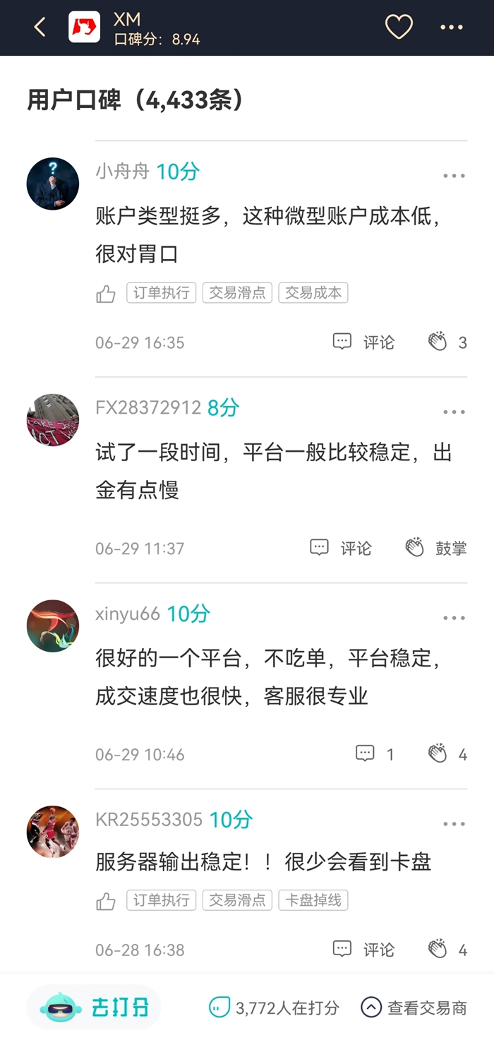 6月XM的口碑以高分评论为主,用户的好评多集中在平台稳定、客服服务到位、点差适中、平台信誉好等方面。