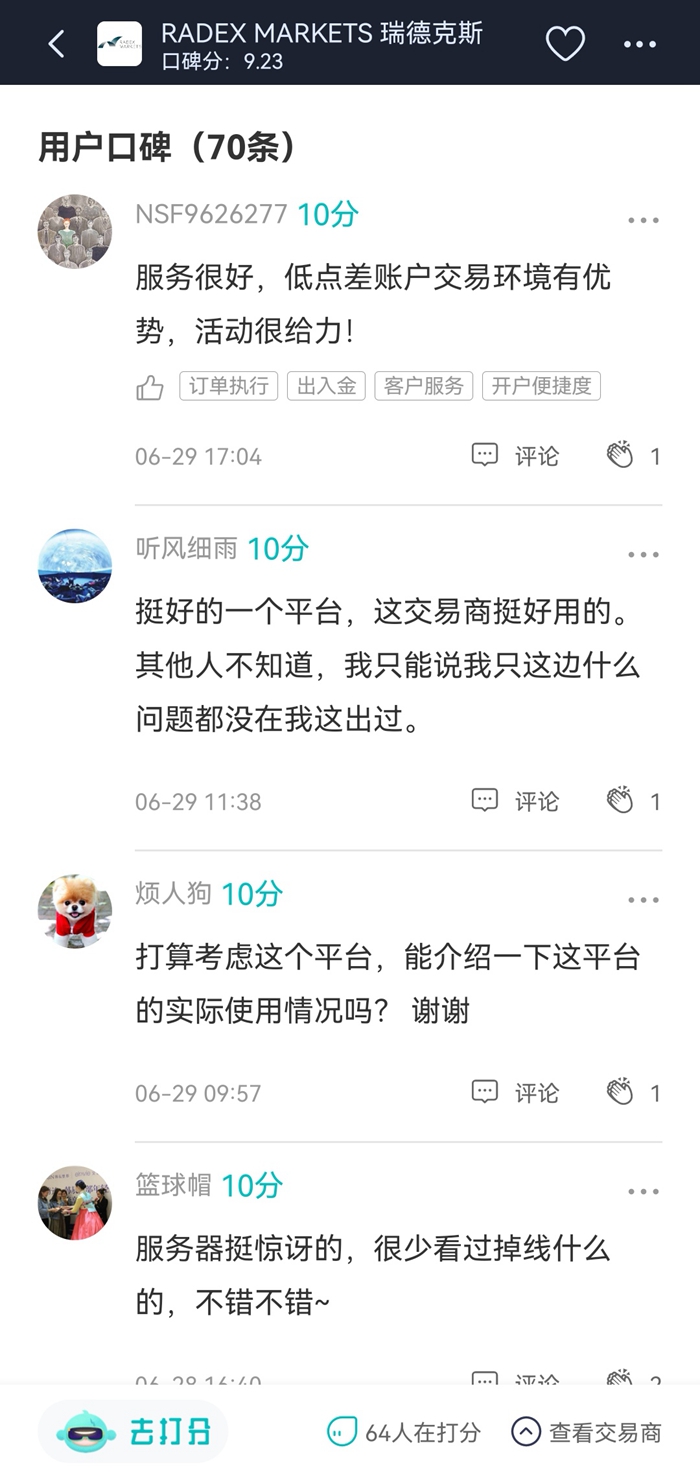 6月,瑞德克斯收到了不少用户口碑,评分以好评为主。交易成本不高、点差低以及客服解答及时,是收到用户好评比较多的点。