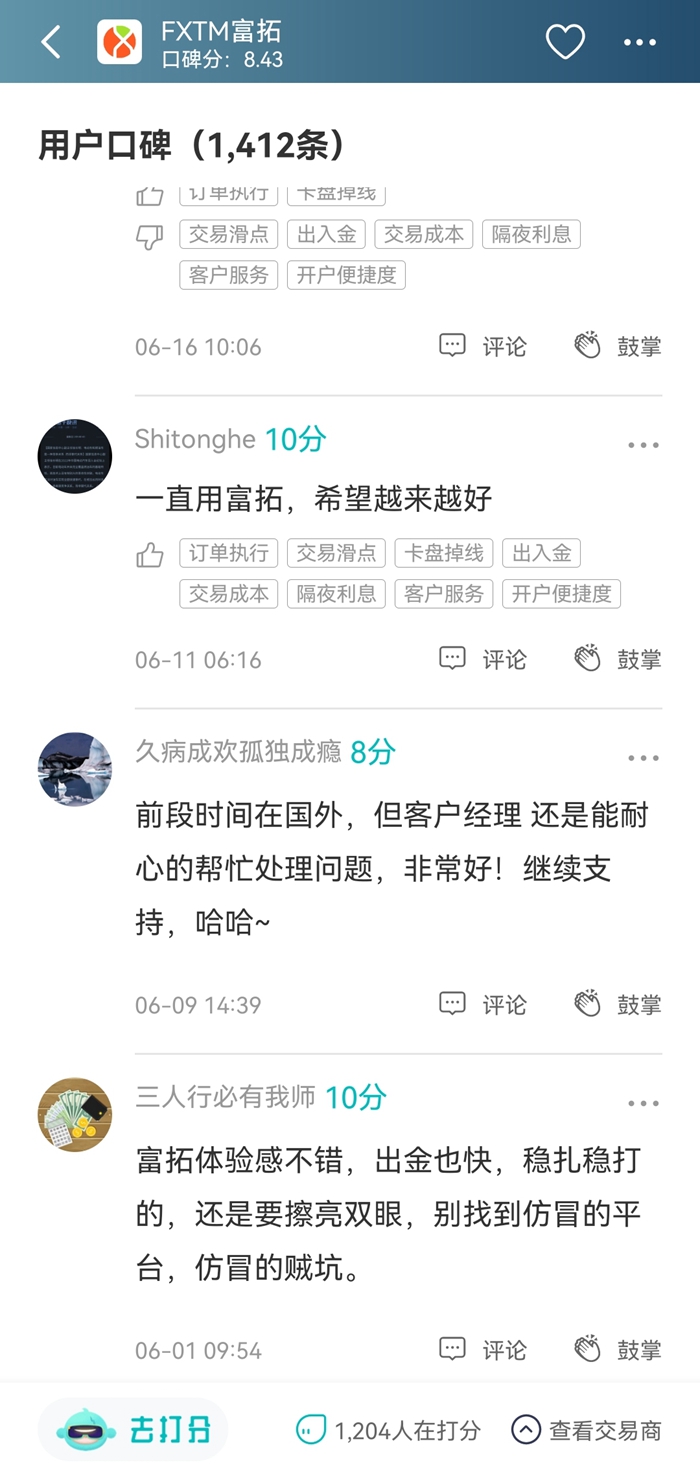 FXTM富拓也是一个非常知名的交易商,在天网查拥有1400多条评论,好评率86%。近期FXTM富拓的口碑中,执行速度快、出金正常、不卡盘都有被用户点评到。但也有几个汇友反应富拓的滑点偏大,希望平台能改进。