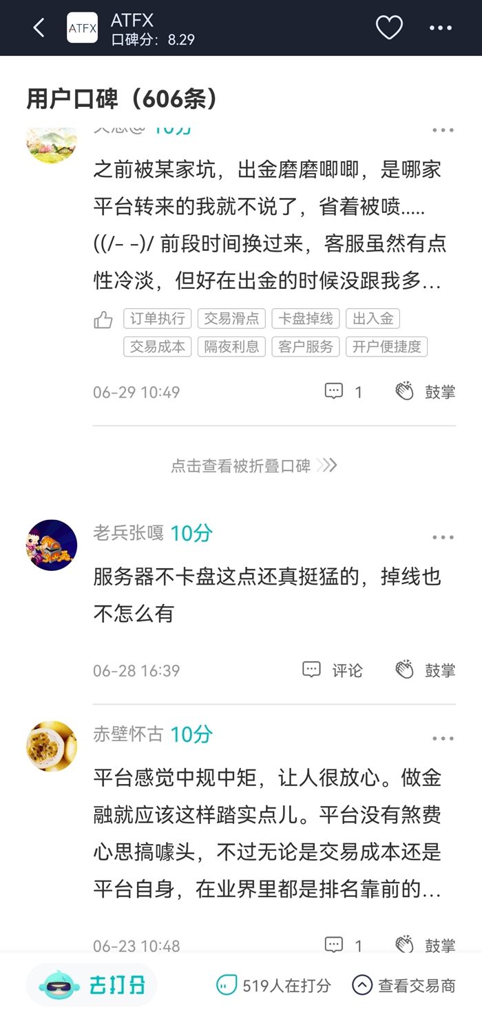 和前面几个上榜平台相比,ATFX不是成立时间最久的交易品牌。它成立于2015年,时间不长不短,而且持有英国FCA牌照,这两点都能给与交易者安全感。在ATFX6月的新口碑中,用户对其出入金速度、交易环境给与了很高的评价。