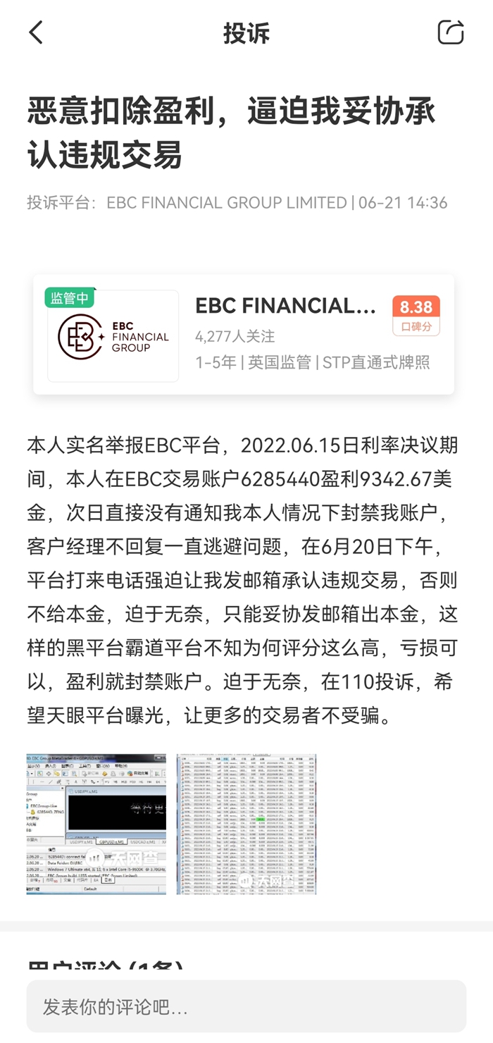 “2022年6月15日利率决议期间,本人在EBC交易账户6285440盈利9342.67美金。次日直接没有通知我本人情况下封禁我账户,客户经理不回复一直逃避问题。6月20日下午,平台打来电话强迫让我发邮箱承认违规交易,否则不给本金。迫于无奈,只能妥协发邮件出本金……”
