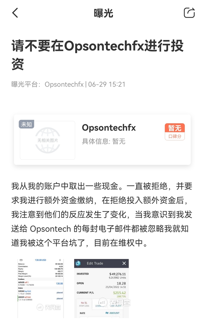 这位汇友曝光的平台是OPSON。令人非常惋惜的是,曝光汇友共计往OPSON平台投入了10万美金!汇友出金期间,OPSON还找了多个借口要他继续往平台入金,好在汇友意识到平台不对劲,都给拒绝了。