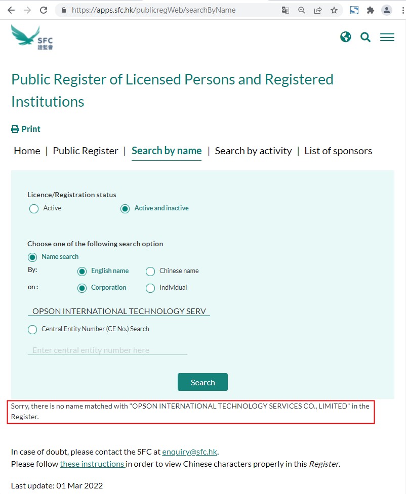 在香港工商页搜索OPSON对应公司的信息,显示公司注册于2018年,处于“已注册”状态。接下来,再去香港SFC查询了OPSON的监管信息,不出所料,没有找到任何匹配信息。也就是说,OPSON是一个没有监管的黑平台,请投资者提高警惕、务必远离。