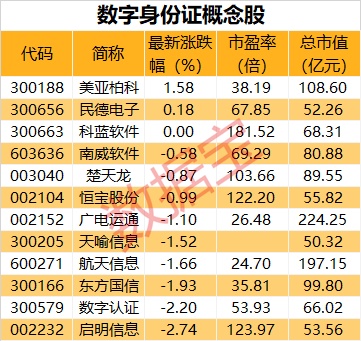 证券时报数据宝统计,数字身份证共有12只概念股,昨日美亚柏科(300188)、民德电子(300656)小幅上涨。美亚柏科表示,公司中标建设的国家级居民身份证电子证照大数据平台正按计划建设推进中。