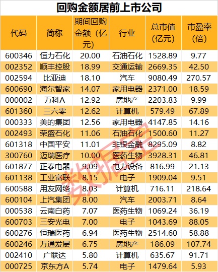 数据宝统计,根据上市公司披露公告,今年以来781家上市公司共回购股份合计590.83亿元,其中129家上市公司回购金额在亿元以上,9家上市公司回购金额超过10亿元,恒力石化(600346)、顺丰控股(002352)、比亚迪(002594)居于前列,分别累计回购20亿元、18.99亿元、18.1亿元。