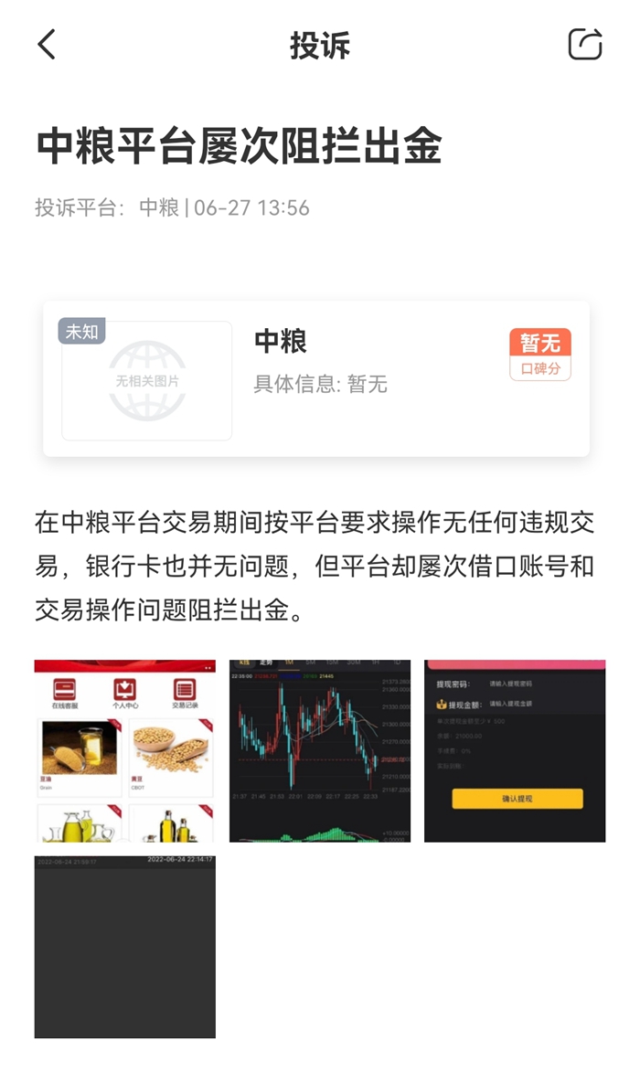 “在中粮平台交易期间按平台要求操作,无任何违规交易,银行卡也并无问题,但平台却屡次借口账号和交易操作问题阻拦出金。”