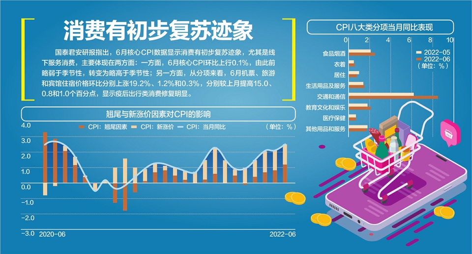 国泰君安研报指出,6月CPI快速上行主要是由于基数效应,也有部分油价上涨和消费修复原因。核心CPI数据显示消费有初步复苏迹象,尤其是线下服务消费。这主要体现在两方面,一方面,6月核心CPI环比上行0.1%,由此前略弱于季节性,转变为略高于季节性。另一方面,从分项来看,6月机票、旅游和宾馆住宿价格环比分别上涨19.2%、1.2%和0.3%,分别较上月提高15.0、0.8和1.0个百分点,显示疫后出行类消费修复明显。