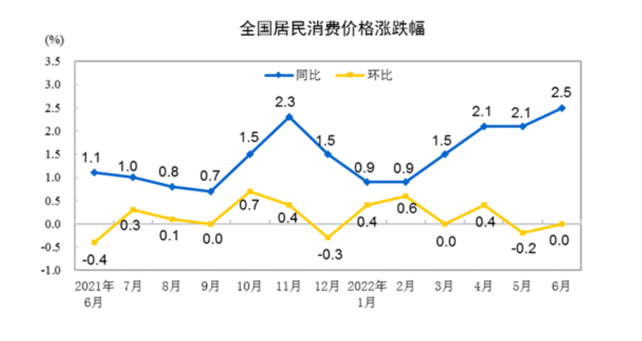 国家统计局高级统计师董莉娟称,在6月份2.5%的CPI同比涨幅中,去年价格变动的翘尾影响约为1.2个百分点,新涨价影响约为1.3个百分点。扣除食品和能源价格的核心CPI同比上涨1.0%,涨幅比上月扩大0.1个百分点。