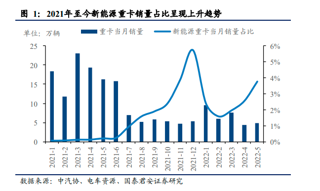 据中汽协数据,2022年以来,新能源重卡销售实现稳步增长。5月新能源重卡共计销售1851辆,1-5月累计销量达7737辆,虽销售量级远不及传统重卡,但由于新能源重卡尤其是换电重卡具有显著的降本优势,终端市场需求被快速激活,行业景气度高涨,致使2022年1-5月新能源重卡销量已达到2021年全年销售水平的73.59%。