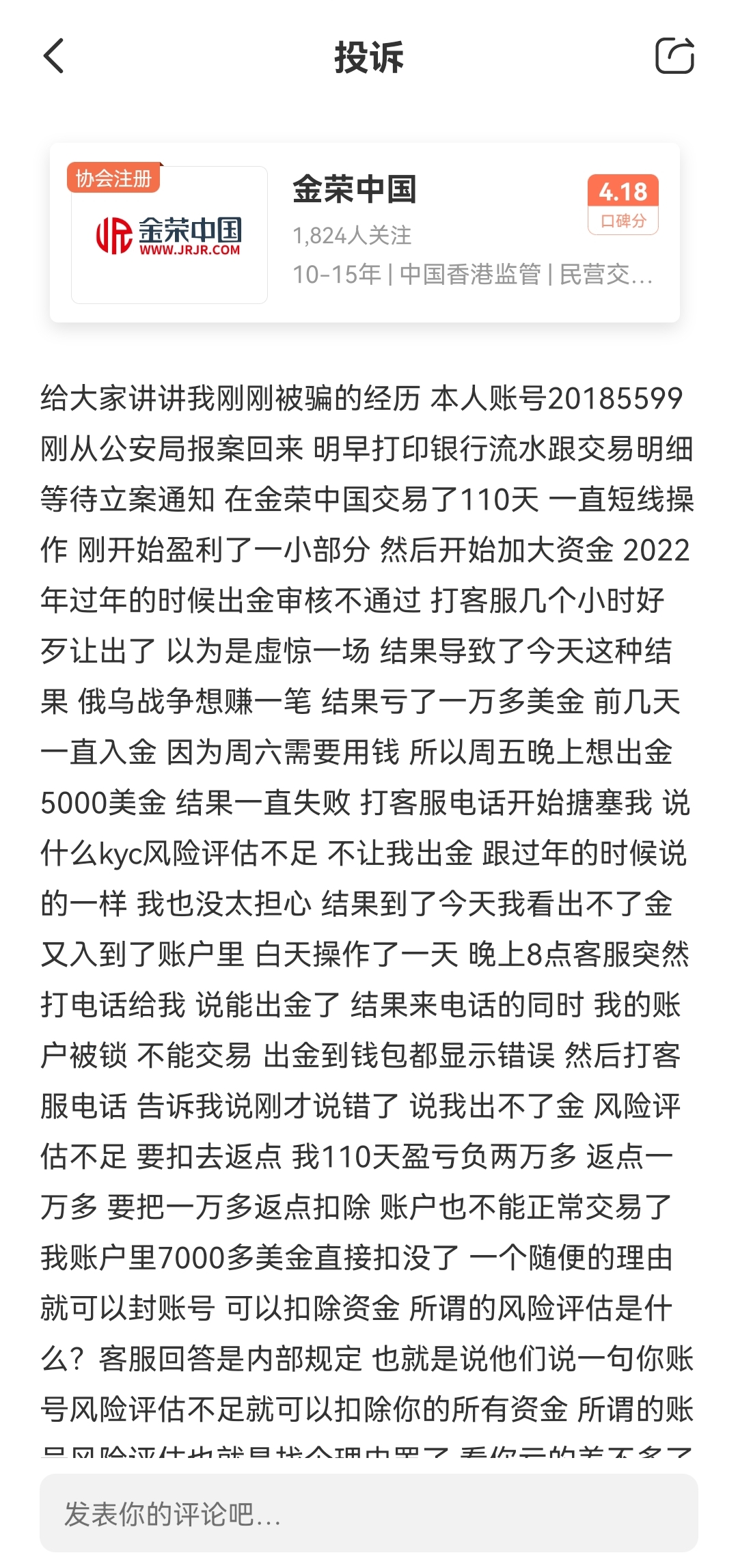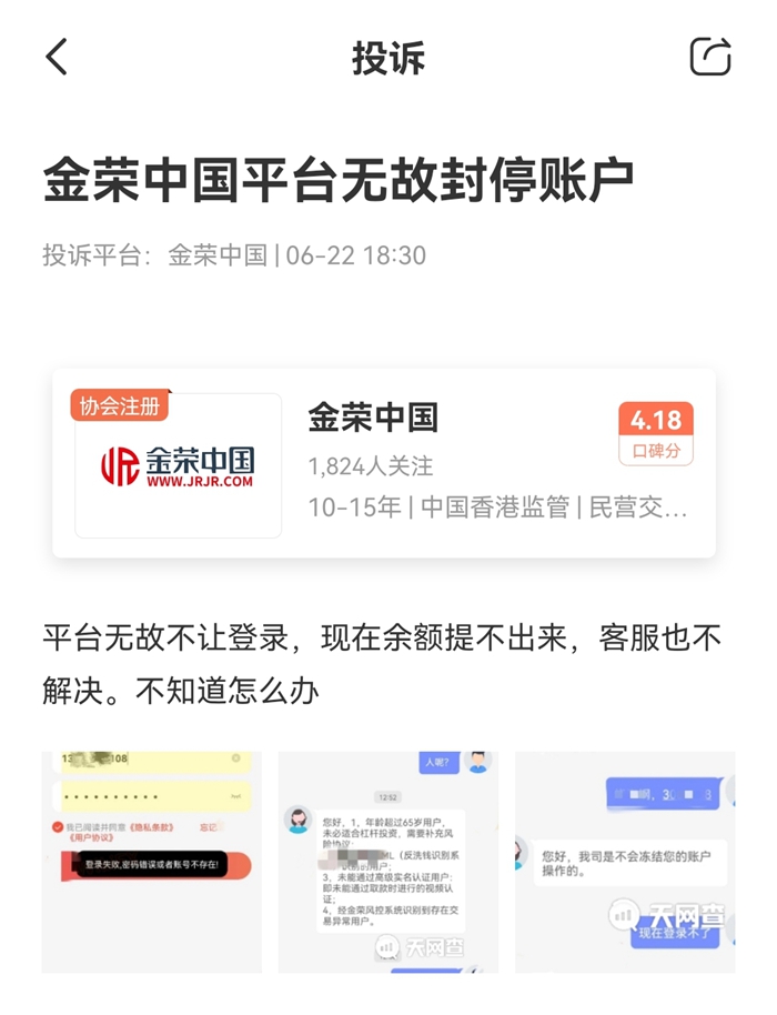 开始咨询金荣中国客服时,收到回复是“我司是不会冻结您的账户操作的”。后面反复咨询账户无法登陆以及账户余额出金问题,客服就帮忙解决了登陆问题。但仍无法出金,原因可能是以下4个:需要补充风险协议、未能通过高级实名认证用户、用户存在交易异常以及反洗钱系统识别用户。具体哪一个以及如何解决,平台却不具体提供,就是不出金。