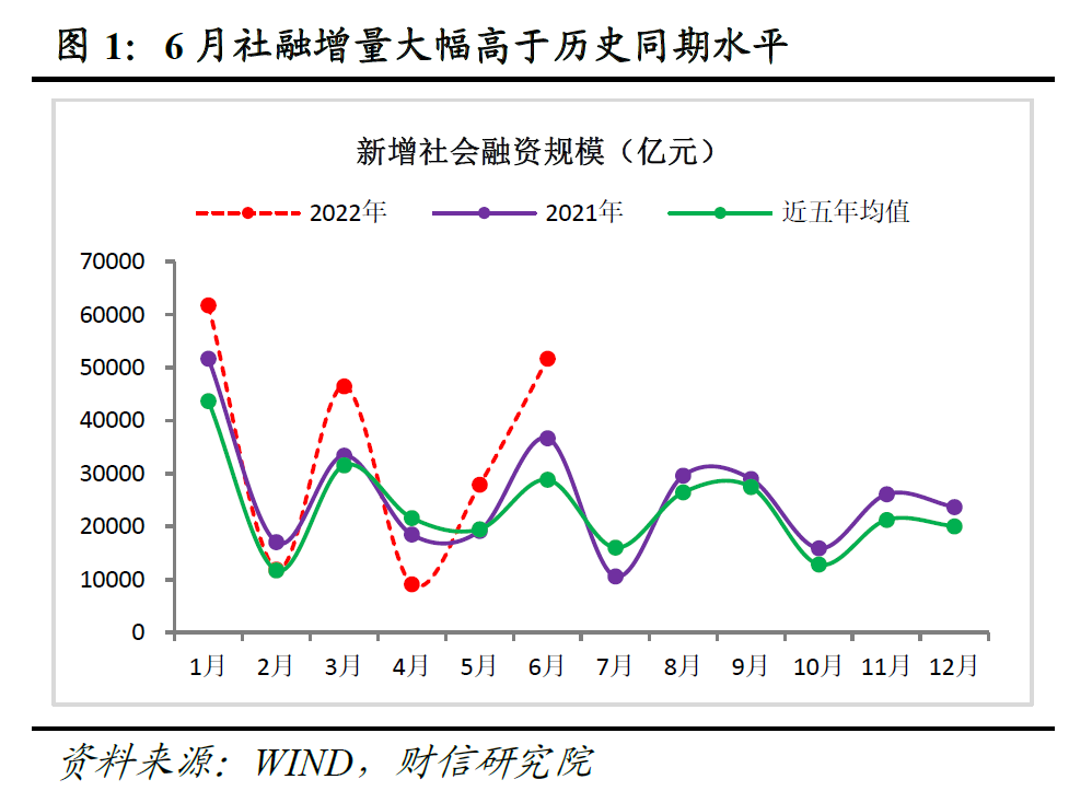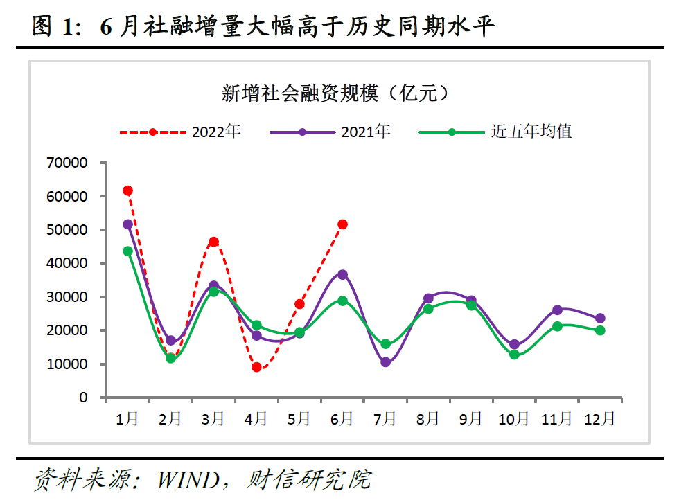 事件:2022年6月份社融增量为5.17万亿元,比上年同期多1.47万亿元;新增人民币贷款2.81万亿元,比上年同期多增6867亿元;货币供应量M1、M2分别同比增长5.8%、11.4%,增速较上月末分别高1.2个和0.3个百分点。
