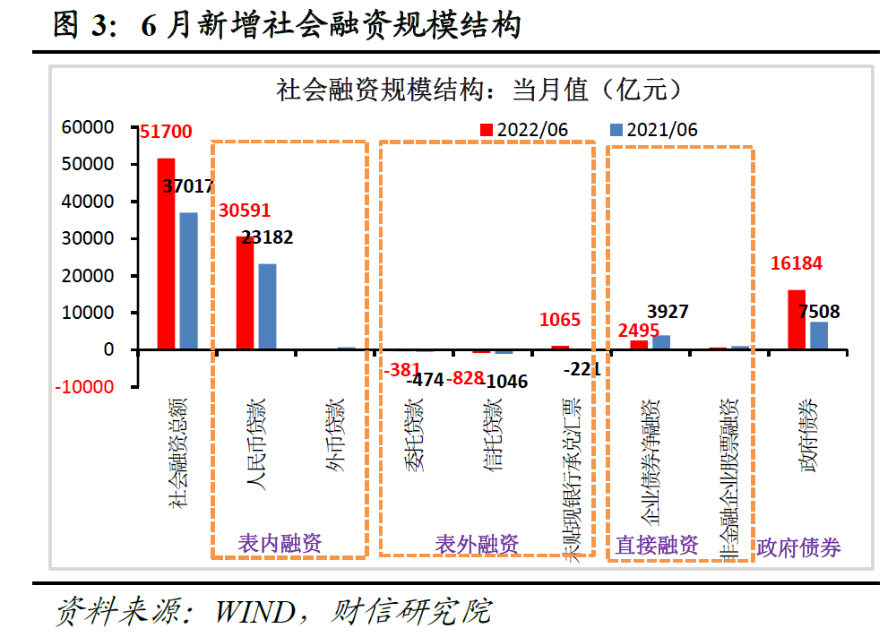 (一)受益于政策发力和需求恢复,政府债券和表内外信贷明显扩张,是社融改善的主因。一是受益于财政部明确要求今年6月底前基本完成新增专项债券发行工作,本月政府债券发行继续加速,推动6月份政府债券净融资额达到1.6万亿元,创下历史单月最高水平,同比多增8676亿元,贡献了本月社融同比增幅的近六成(见图3-4)。二是随着国内疫情冲击明显缓解和扩信贷等系列政策加快发力显效,实体信贷需求继续回暖,6月新增人民币贷款(社融口径)较上月多增7409亿元(见图3),也是社融改善的重要支撑因素。三是本月国内需求改善,特别是基建和房地产投融资需求边际恢复,带动表外融资降幅继续收窄,同比少减少1597亿元,也有利于社融回升。其中,表外融资三大分项未贴现银行承兑汇票、信托贷款、委托贷款分别同比多增1286亿元、少减218亿元和少减93亿元(见图3),前者改善幅度最大,一方面与票据融资向表内转化有所减少相关,另一方面也反映出实体企业的经济活力有所恢复。