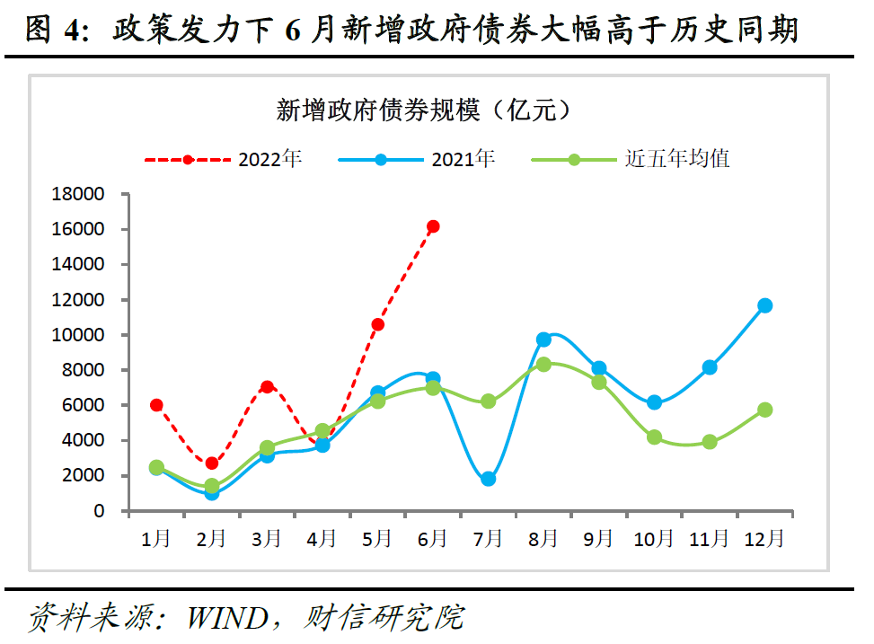 此外,6月社融总量大幅扩张、增速明显回升,与政府债券前置集中发行密切相关,1-6月份国内新增政府债券规模已完成全年目标的70%左右,进度比2021年同期快一倍以上。但根据政府工作报告安排,今年新增政府债券(赤字规模+专项债)总额度为7.02万亿元,较2021年还少2000亿元,若没有新的增量政策出台,下半年政府债券将由对社融形成支撑转为拖累。同时,考虑到居民部门信贷恢复仍偏慢,预计下半年宽货币向宽信用传导或面临波折,社融增速仍存在回调和波动风险。
