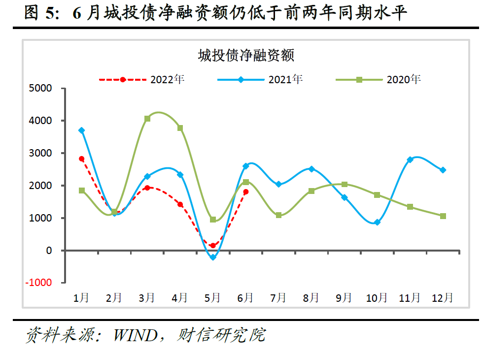 (二)受城投融资仍偏紧和金融市场波动加大影响,企业债和股票融资继续对社融形成拖累。一方面,6月份企业债券净融资额同比减少1432亿元,是本月社融的最大拖累项。其中,受坚决遏制新增地方政府隐性债务约束等因素的影响,6月份城投债券净融资额同比减少900多亿元,低于近两年同期水平(见图5),是企业债融资偏弱的主因。另一方面,随着资本市场波动加大,股市赚钱效应下降,加上企业盈利趋于回落,股票融资对社融的支撑持续弱化。6月份非金融企业股票净融资额仅588亿元,为2020年下半年以来第二低位,同比减少368亿元。