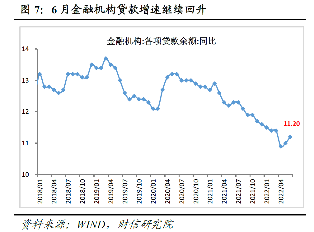 6月份金融机构新增人民币贷款2.81万亿元,比上年同期多增6867亿元(见图6);各项贷款余额增速为11.2%,较上月回升0.2个百分点,连续两个月提高(见图7),表明实体信贷需求持续回暖。与此同时,实体信贷结构也已出现明显改善迹象,如企业部门加杠杆是本月信贷扩张的主力,且企业短贷和中长贷同比均大幅多增;相比之下,居民部门信贷修复仍偏慢,居民中长贷同比继续少增,反映出居民购房需求恢复仍待时日。