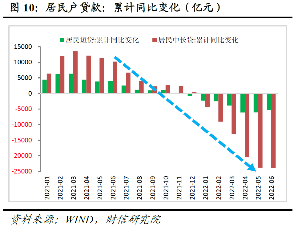 (二)居民端:短贷和中长贷均有改善,但中长贷同比仍为负映射购房需求仍偏弱。6月份,居民部门新增贷款同比降幅由上月的3000多亿元收窄至203亿元(见图8),表明居民信贷需求边际改善,但总体恢复仍偏慢,居民信用收缩压力仍未全面缓解。其中,6月份居民中长贷同比减少989亿元,1-6月累计同比减少1.87万亿元(见图10),是居民部门信贷收缩的主要拖累项,反映出当前居民购房意愿改善偏慢。高频数据显示,6月份国内30大中城市商品房成交面积同比降幅由上月的-48%收窄至-10%以内,但7月上旬该降幅继续扩大,表明国内房地产市场的恢复仍偏弱且具有不确定性,或需要政策继续加力以维“稳”。相比之下,受疫情冲击缓解和促消费政策加码的影响,居民消费需求如汽车贷款改善,推动本月居民新增短贷较上月扩张一倍以上,同比多增782亿元。