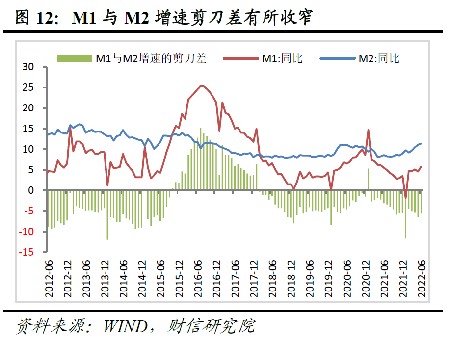 6月末M2同比增长11.4%,增速较上月提高0.3个百分点(见图11),原因主要有四:一是本月信贷明显扩张导致贷款创造存款的信用货币创造加快,对M2增速回升形成主要支撑。二是受财政支出力度加大和节奏继续加快的影响,本月财政存款环比减少9959亿元、同比减少365亿元,有利于阶段性增加同时段银行体系存款,也有利于M2增速提高。三是央行继续上缴结存利润,直接增强财政可用财力,将会在财政支出后直接增加企业现金流,也会对M2形成支撑。四是疫情等冲击下,企业盈利下降、居民增收就业困难导致企业投资和居民消费支出减少,并推高两者储蓄意愿,如6月份居民贷款同比仍为负,但居民存款同比多增2400多亿元,导致准货币增速提高0.5个百分点,对M2形成助力。此外,央行的调查数据也显示,2022年二季度城镇居民中倾向于“更多储蓄”的占比达58.3%,刷新2002年以来历史新高。