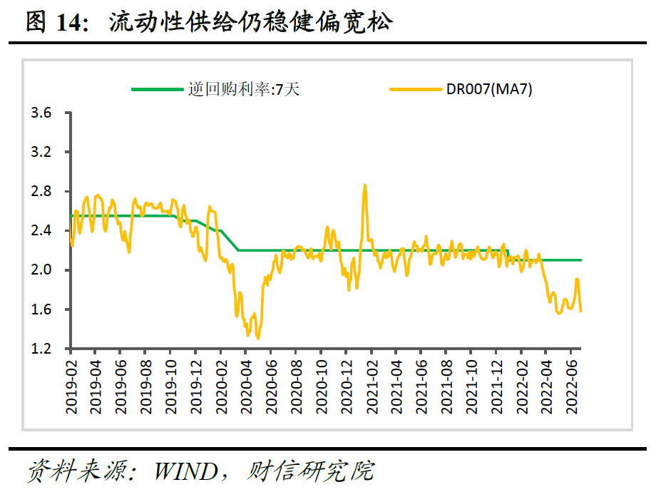 但总体来看,稳增长、稳就业仍是货币政策的首要目标,下半年货币政策总基调维持稳健偏松、适当加力可期,且重点会放在稳定信贷增长上,防止居民部门信用持续收缩;同时受稳物价、稳汇率目标的制约,宽松力度或总体温和,配合财政发力、结构性政策加力仍为主导。具体来看:一是预计下半年货币供给仍将合理充裕(见图14),DR007利率大概率仍处于政策利率下方附近,且不排除降准的可能;二是下半年宽信用是重中之重,预计将重点通过结构性政策工具加力、稳住房地产融资和配合财政发力等三大抓手来支持信用扩张;三是预计下半年全面降息概率偏小,但不排除非对称调降5年期LPR利率的可能。