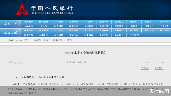 5月新增信贷和社融规模超预期增长后,6月金融数据备受市场期待。7月11日,央行官网发布2022年上半年金融统计数据报告,多项数据走势强劲。数据显示,截至2022年6月末,广义货币(M2)余额258.15万亿元,同比增长11.4%,创下2016年以来新高。6月新增信贷、社融均明显回升。