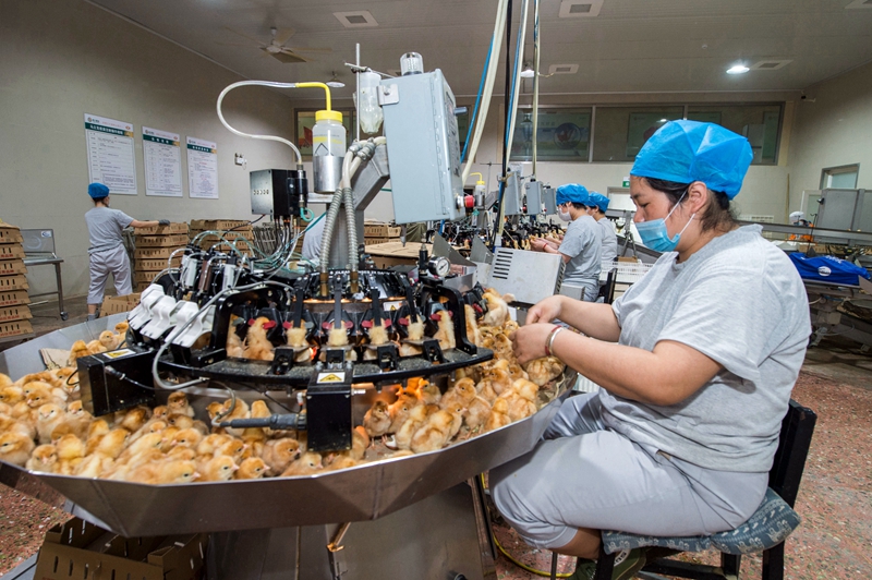 农发行北京平谷支行积极落实“助企23条”,及时向北京市华都峪口禽业有限责任公司发放1亿元流动资金贷款,发挥投贷联动协同优势,支持其种业发展,有效缓解了企业资金压力,有效确保企业蛋种鸡存栏量,保证了全国鸡蛋市场价格稳定。图为华都峪口禽业工人在生产作业中。 本报记者 刘志良 摄
