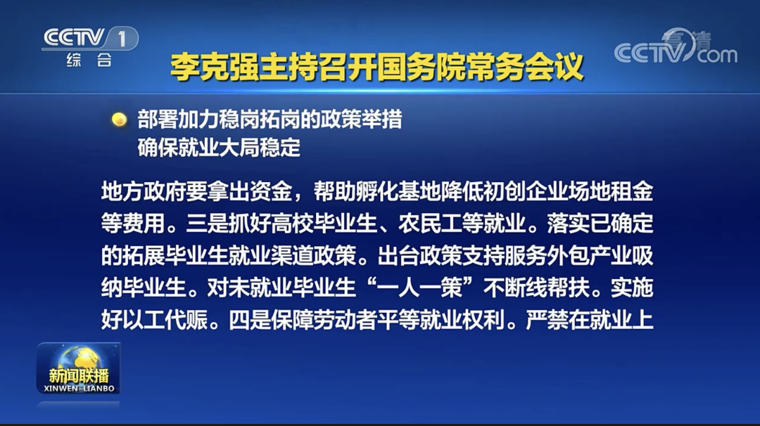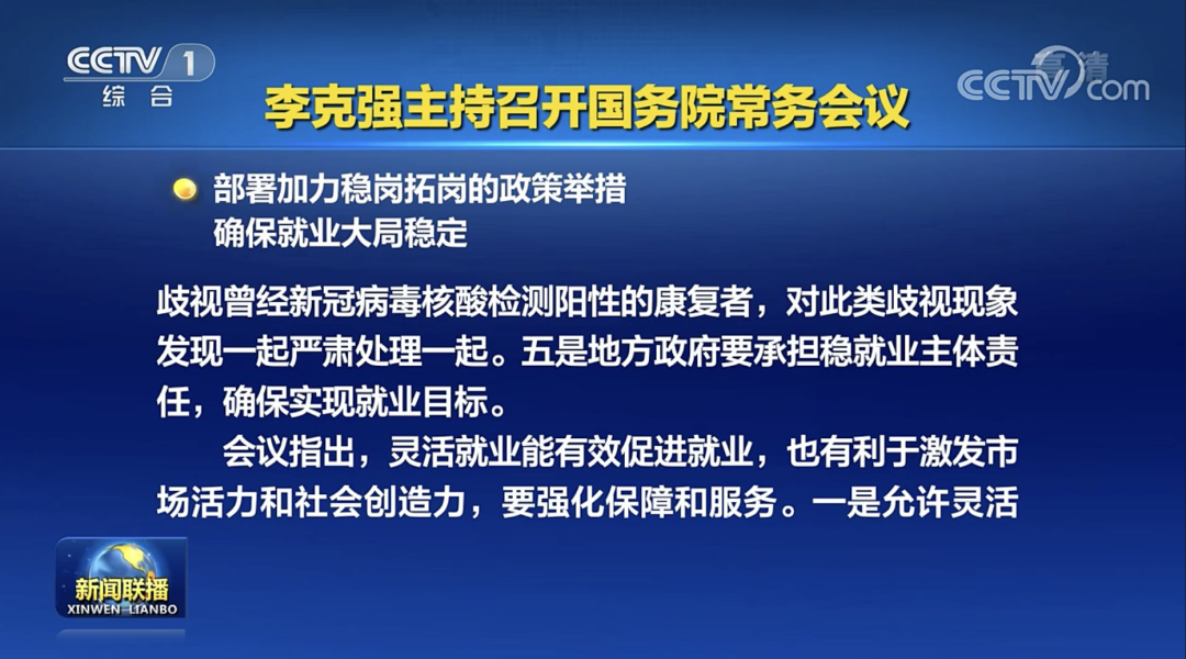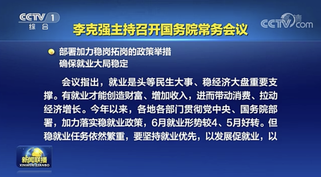 会议指出,就业是头等民生大事、稳经济大盘重要支撑。有就业才能创造财富、增加收入,进而带动消费、拉动经济增长。今年以来,各地各部门贯彻党中央、国务院部署,加力落实稳就业政策,6月就业形势较4、5月好转。但稳就业任务依然繁重,要坚持就业优先,以发展促就业,以稳就业支撑经济加快恢复。一是继续以保市场主体稳就业。持续落实助企纾困政策,打通落实堵点,实行社保费缓缴、稳岗返还等打包办理。二是更多用市场化社会化办法增岗位。支持以创业带就业,对符合条件的初创企业和个体工商户,继续发放最高20万元创业担保贷款并由财政贴息。地方政府要拿出资金,帮助孵化基地降低初创企业场地租金等费用。三是抓好高校毕业生、农民工等就业。落实已确定的拓展毕业生就业渠道政策。出台政策支持服务外包产业吸纳毕业生。对未就业毕业生“一人一策”不断线帮扶。实施好以工代赈。四是保障劳动者平等就业权利。严禁在就业上歧视曾经新冠病毒核酸检测阳性的康复者,对此类歧视现象发现一起严肃处理一起。五是地方政府要承担稳就业主体责任,确保实现就业目标。