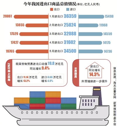 7月13日上午,我国外贸进出口“半年报”出炉。海关总署新闻发言人、统计分析司司长李魁文在国新办召开的新闻发布会上介绍,今年上半年我国货物贸易进出口总值为19.8万亿元人民币,同比增长9.4%。其中,出口11.14万亿元,增长13.2%;进口8.66万亿元,增长4.8%。我国外贸进出口已连续8个季度实现同比正增长。