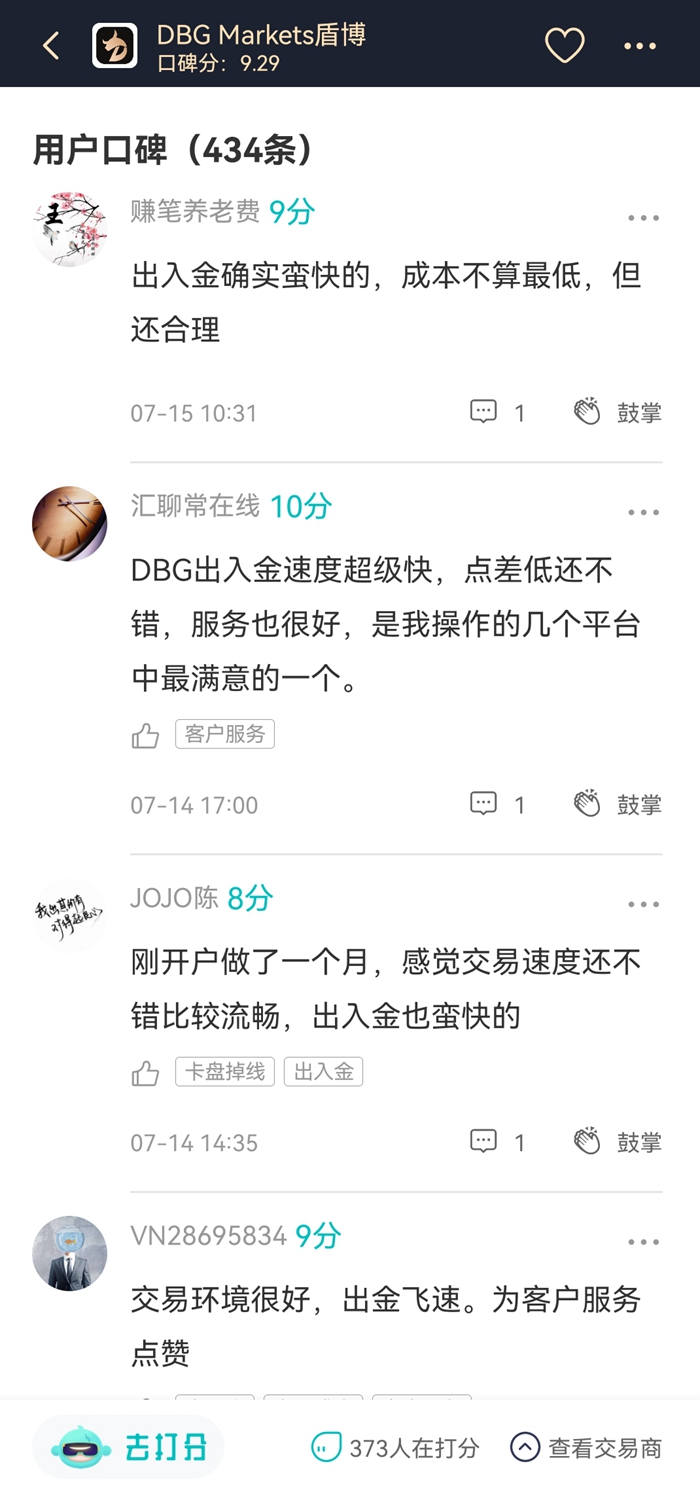 “出入金确实蛮快的”,“DBG出入金速度超快”,都是用户对其评价,希望DBG Markets盾博能继续发挥这个优势。
