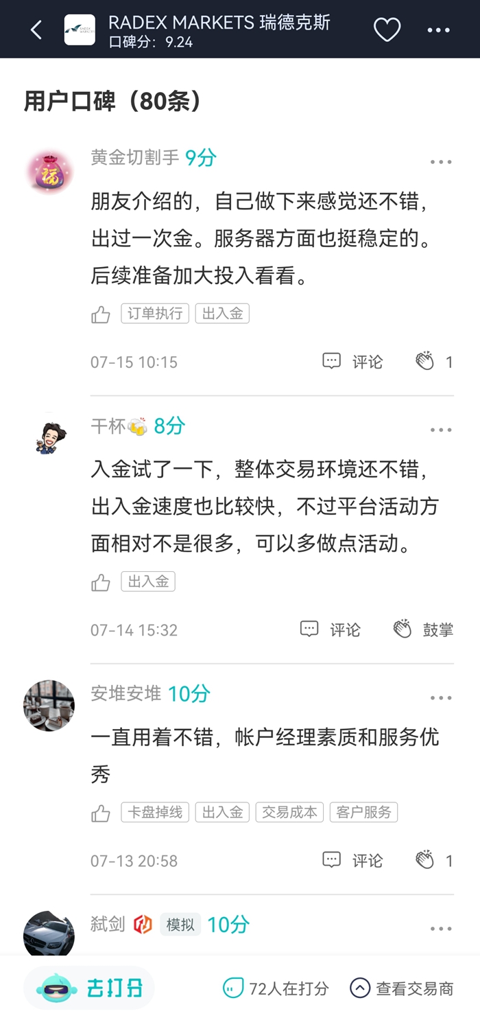 而进瑞德克斯体验的交易者,有的说“服务器方面也挺稳定的”;有的称它“整体交易环境还不错,出入金速度也比较快”。