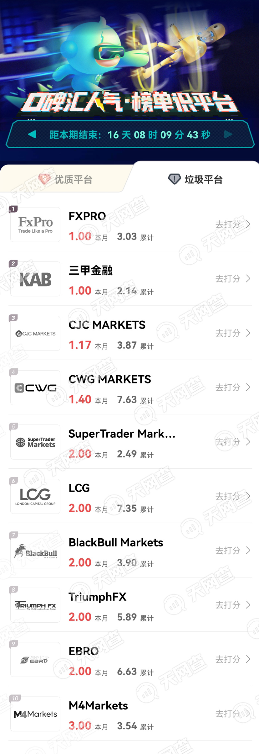 按时出金,是一个交易者对平台最低也是最高的要求,只要出金没问题,那平台的交易环境差点、点差大点都能接受。今天周一,又是新的一周,上周天网查汇友口碑榜也已揭榜,接下来我们看看优质榜单和垃圾榜单都有哪些平台。