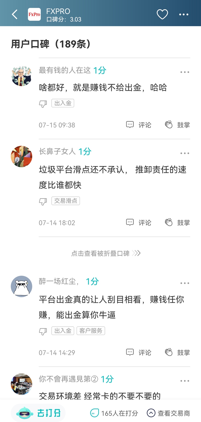 FXPRO最近的汇友口碑,有的已经被气笑,“啥都好,就是赚钱不给出金,哈哈”;有的气愤至极,“垃圾平台滑点还不承认, 推卸责任的速度比谁都快”……总之,没进入FXPRO泥坑的交易者,看到赶紧绕道走吧。