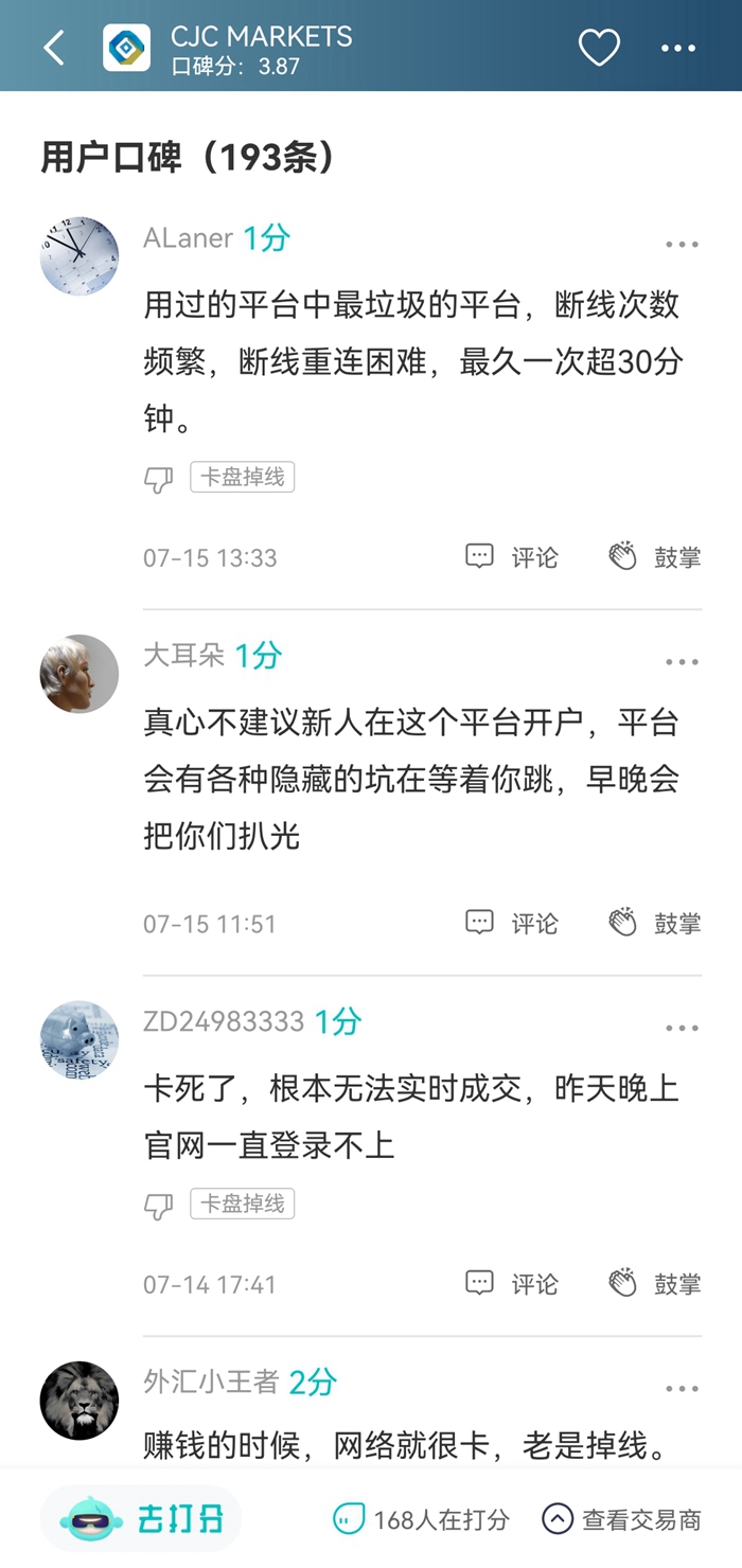 最近用户对CJC MARKETS的评价,主要包括:平台断线频繁、卡得无法实时成交。