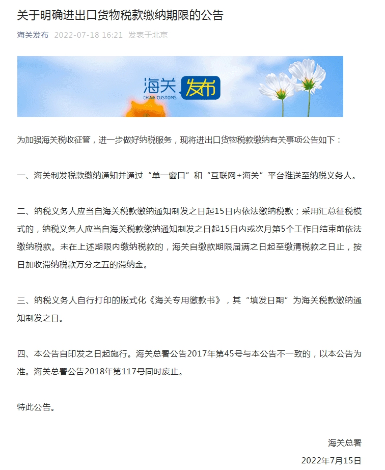 中新经纬7月18日电 “海关发布”微信号18日发布《关于明确进出口货物税款缴纳期限的公告》(下称公告),明确进出口货物纳税义务人应当自海关税款缴纳通知制发之日起15日内依法缴纳税款。