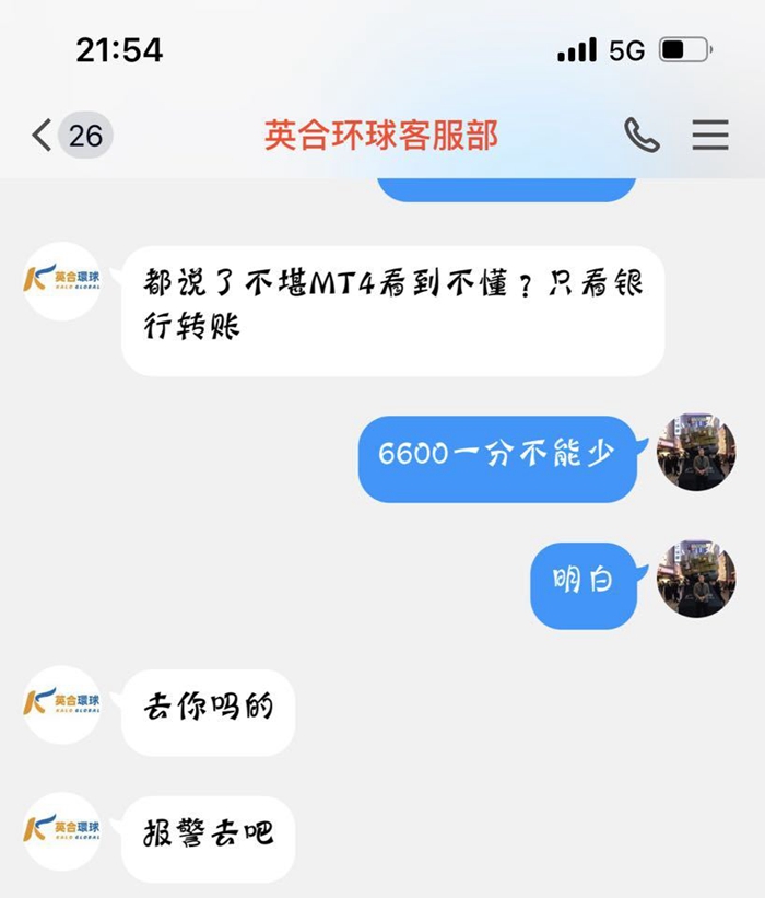 周先生找平台理论,想要回本金,可英合环球的客服部连基本的礼貌都不维持,一问客服就极不耐烦、脏话连篇。“都说了不看MT4不懂?只看银行转账”,“不行你就报警呗”,然后直接客服直接将周先生删除好友,还踢出了之前的技术交流群。