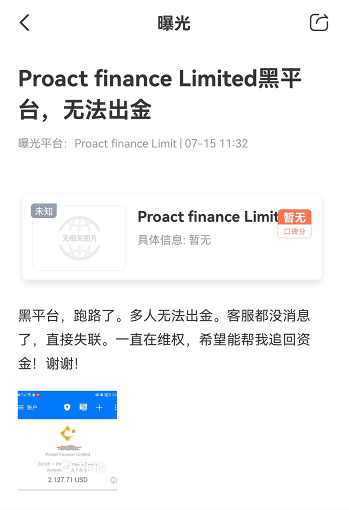 最近,天网查收到一条用户曝光,投诉者在一个名为Proact finance Limited的平台交易,申请出金2127美元却一直不成功,平台客服也失联了。因为被骗资金不算太大,汇友一直在包括天网查在内的多家行业媒体寻求帮助,希望能追回资金。